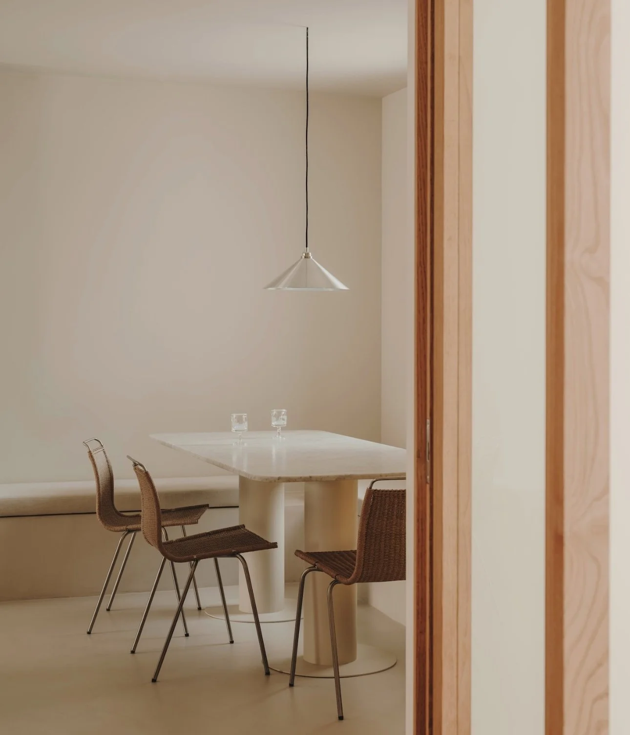 Empty dining area with a rectangular marble table, four brown chairs, two glasses, a modern pendant light, and wood framing.